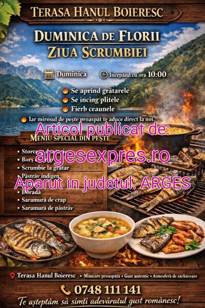 Duminica de Florii – Festivalul Scrumbiei la Terasa Hanul Boieresc argesexpres.ro 2 aprilie 2026 Acțiune FacebookXPinterestWhatsApp Duminica de Florii – Festivalul Scrumbiei la Terasa Hanul Boieresc Sursa: https://argesexpres.ro/index.php/actualitate/56833-duminica-de-florii-festivalul-scrumbiei-la-terasa-hanul-boieresc Acțiune FacebookXPinterestWhatsApp Ultimă oră argesexpres.ro Zece localități din Argeș, printre care și Mușătești, incluse în sistemul de cadastru și carte funciară Robo Stiri - 2 aprilie 2026 criterii.ro Elev de 10 „curat” din Pitești! Performanță rară pentru un licean de la Zinca Golescu la preadmiterea de la Politehnică București – Criterii.ro Robo Stiri - 2 aprilie 2026 epitesti.ro Argeș. Beat la volan, dar surprizele au continuat după control Robo Stiri - 2 aprilie 2026 jurnaluldearges.ro Bughea de Sus: Tupeu maxim! La volan, băut, fără ITP și RCA Robo Stiri - 2 aprilie 2026 Același autor argesexpres.ro Zece localități din Argeș, printre care și Mușătești, incluse în sistemul de cadastru și carte funciară 2 aprilie 2026 argesexpres.ro Elevă de la Școala Gimnazială „Mircea cel Bătrân”, calificată la Olimpiada Națională de Limba și Literatura Română 2 aprilie 2026 argesexpres.ro Dacia pregătește lansarea unui nou model la doar 6.000 de euro 2 aprilie 2026 argesexpres.ro Elevii Școlii Gimnaziale „Mircea cel Bătrân”, rezultate remarcabile la olimpiadele județene 2 aprilie 2026